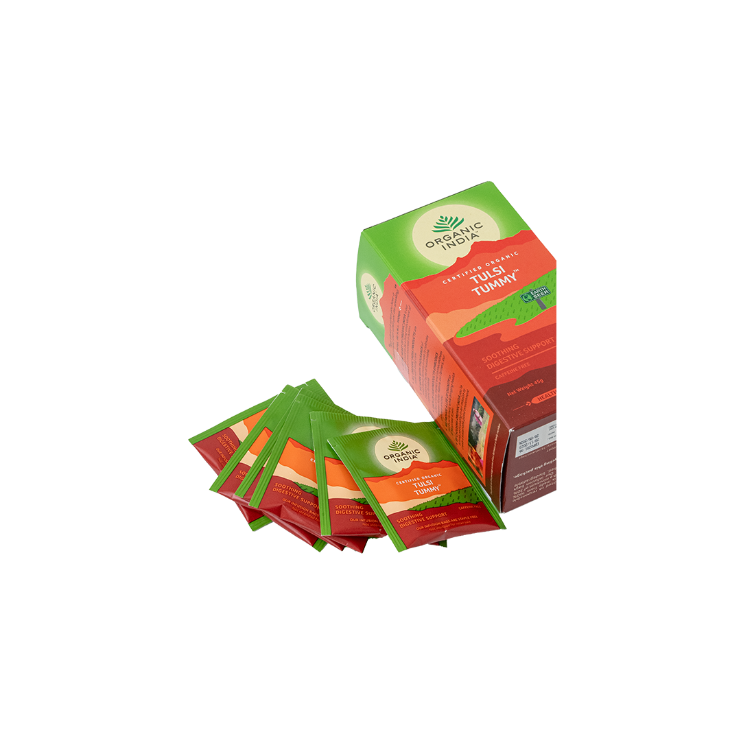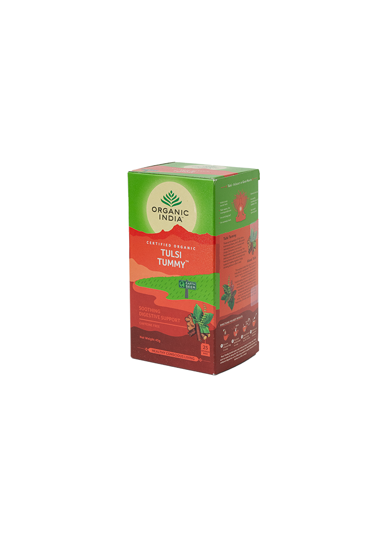 Τρεις ιερές ποικιλίες του Tulsi: Vana, Krishna και Rama, που προσφέρουν ισχυρές αναπλαστικές δυνάμεις, αρωματισμένα με Τζίντζερ, Κανέλα, Γλυκόριζα και Μέντα συνθέτουν το τσάι Tummy. Αυτή η λαχταριστή και ενεργή καταπραϋντική και θεραπευτική σύνθεση βοτάνων ηρεμούν το στομάχι και υποστηρίζουν την υγιεινή πέψη. Απολαύστε το τσάι πίνοντάς του πριν ή μετά από γεύμα.